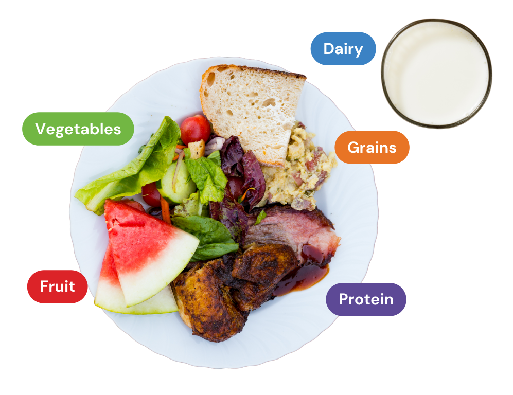 MyPlate is a visual guide from the USDA that helps you create balanced meals by showing the amount to eat from each food group: fruits, vegetables, grains, protein, and dairy or fortified soy alternatives.